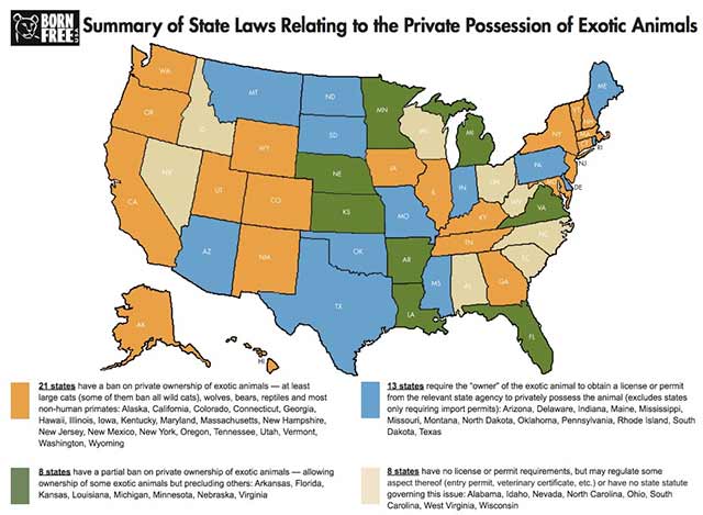 Above: States shaded beige allow unrestricted exotic animal ownership